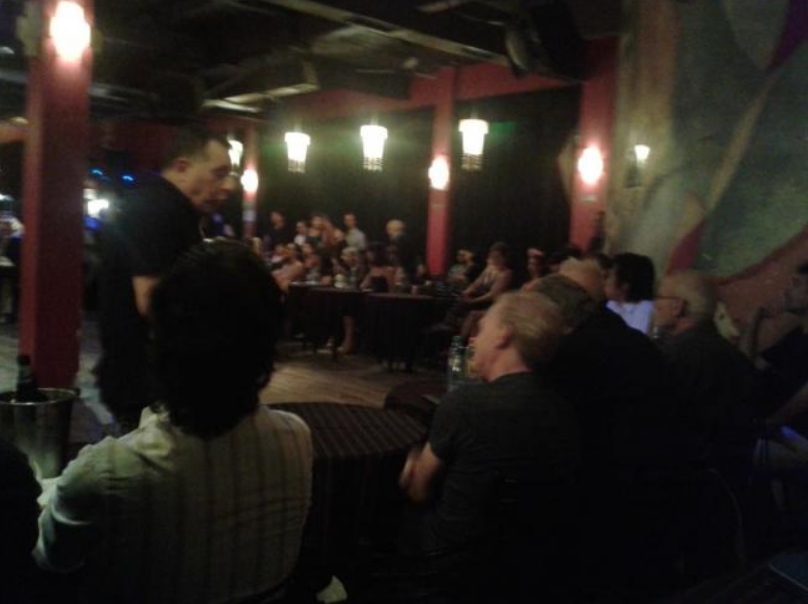 Nous sommes tassés comme des sardines dans une boîte. Les places sont imposées. Nous sommes tous, hommes et femmes du groupe alignés contre un mur. Les chaises se touchent, devant nous des petites tables rondes espacées par une chaise elle-même occupée par une personne qui nous tourne le dos et empêche tout passage. Pris au piège ! Encore plus devant, un mur continu de dos d’hommes bien rangés serrés ! Plus loin encore la piste avec des côtés rangées de femmes allignées. Les hommes sont en face dans la même disposition. C’est la pire situation jamais vue. De plus il n’est pas recommandé d’être assis à côté d’une femme car cela veut dire qu’elle est accompagnée et limite du coup sérieusement ses chances d’invitations, et je me trouve assis entre deux femmes du groupe. Je décide de partir. Elles auront quelques chances d’être invitées (peut être) et quant à moi je n’ai aucune possibilité dans ces conditions de faire des miradas.