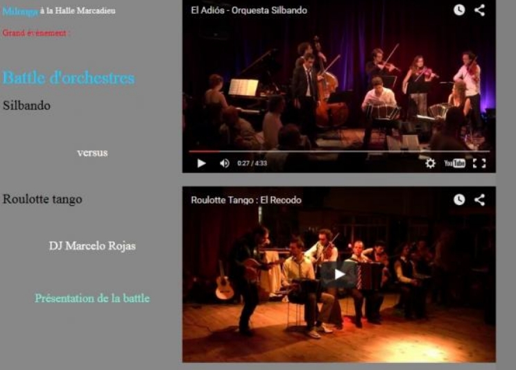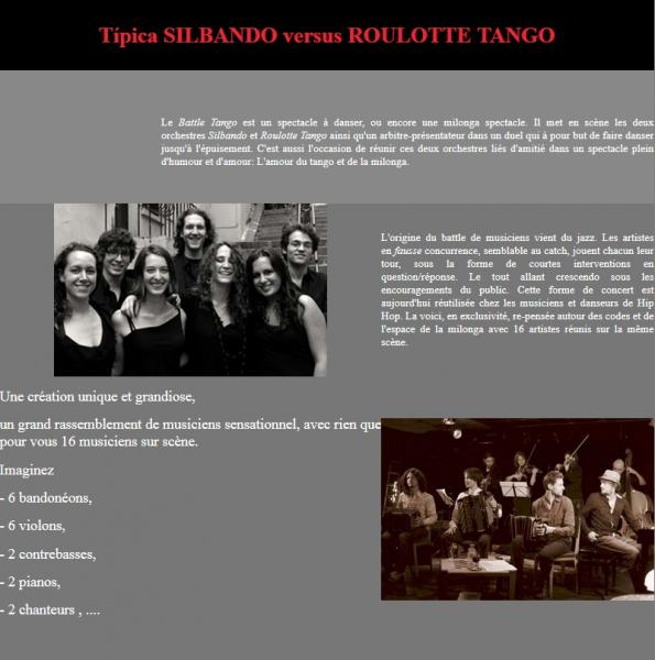 Un beau spectacle, car il s’agit avant tout d’un spectacle qui met en scène deux orchestres : Silbando et Roulotte Tango. Deux groupes de musiciens qui ont la même structure orchestrale, un répertoire certainement identique (ou du moins comparable), bref un même public ! L’idée originale des organisateurs du festival est donc de créer un divertissement à partir d’une lutte supposée entre ces deux équipes de joyeux lurons de la musique.